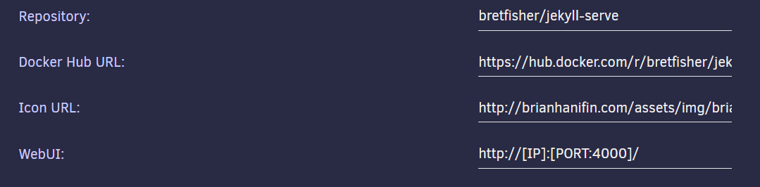Docker sure seems like the ideal candidate to run Jekyll. If I could get Jekyll installed in Docker on my Unraid server, I could point it to my github folder and have it automatically start the webserver.